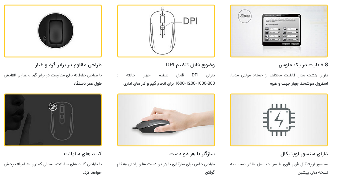 | سایر قابلیت ها | 8 قابلیت در یک موس-دارای سنسور اوپتیکال-اسکرول پهن-دارای کلیک های بی صدا |