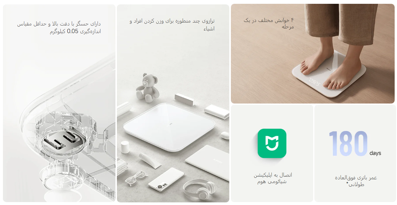 | سایر قابلیت ها | محاسبه شاخص تودهی بدنی (BMI) توسط نرمافزار -ترازوی چند منظوره برای وزن کردن افراد و اشیاء-ذخیره اطلاعات 36 کاربر- عمر باتری طولانی - کالیبراسیون خودکار - قابلیت اتصال به گوشی هوشمند از طریق نرم افزار Xiaomi Home- طراحی کلاسیک و زیبا - سیستم خاموشی خودکار - دارای پایههای لاستیکی که در کف ترازو جهت جلوگیری از لرزش و اندازه گیری دقیق وزن |